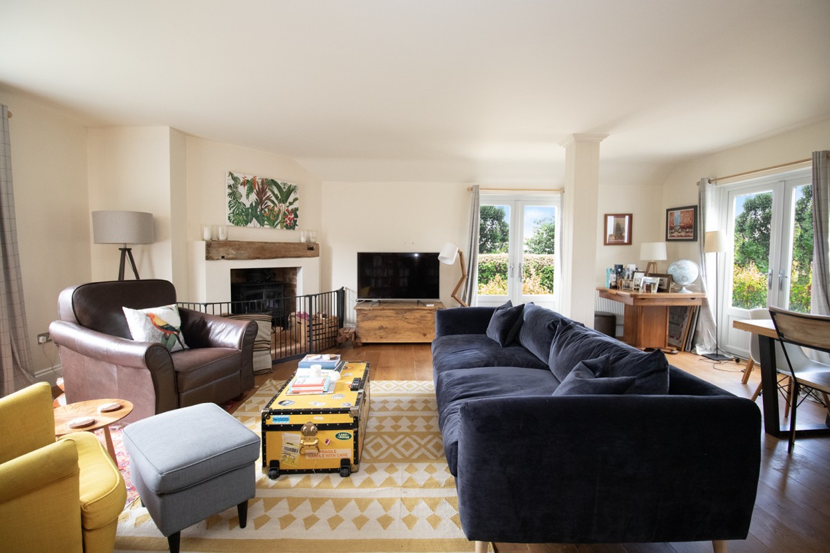 featuring a wood burner and French doors leading to the