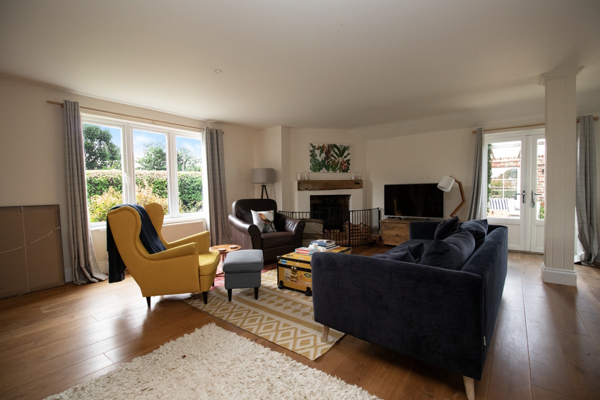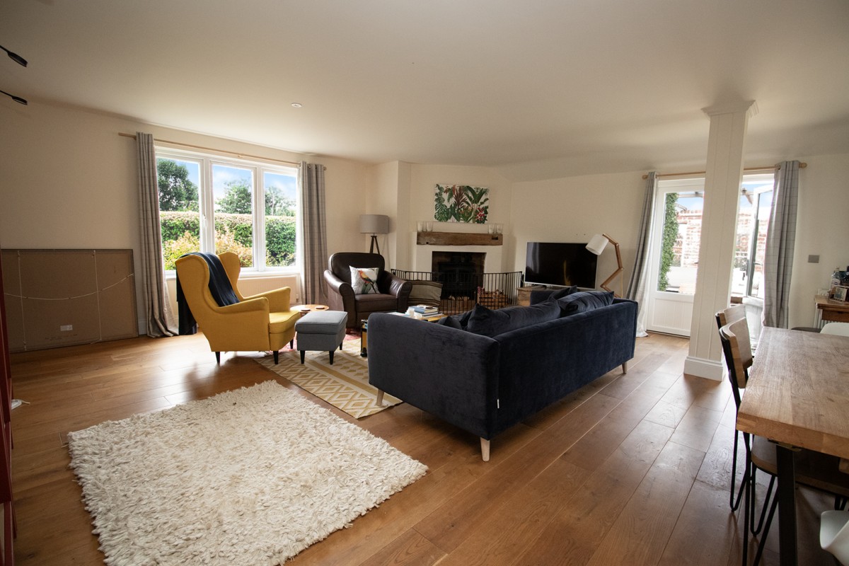 meals or entertaining. To the left of the hallway is a cosy lounge