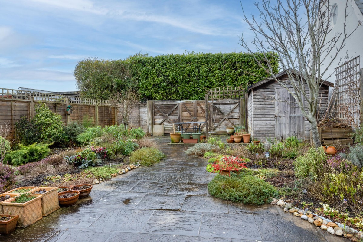 The rear garden is larger than expected, featuring a patio, shed, and a further rear patio platform. Large gates open onto a rear access road, allowing for off-street parking, a real bonus in this sought-after village location.