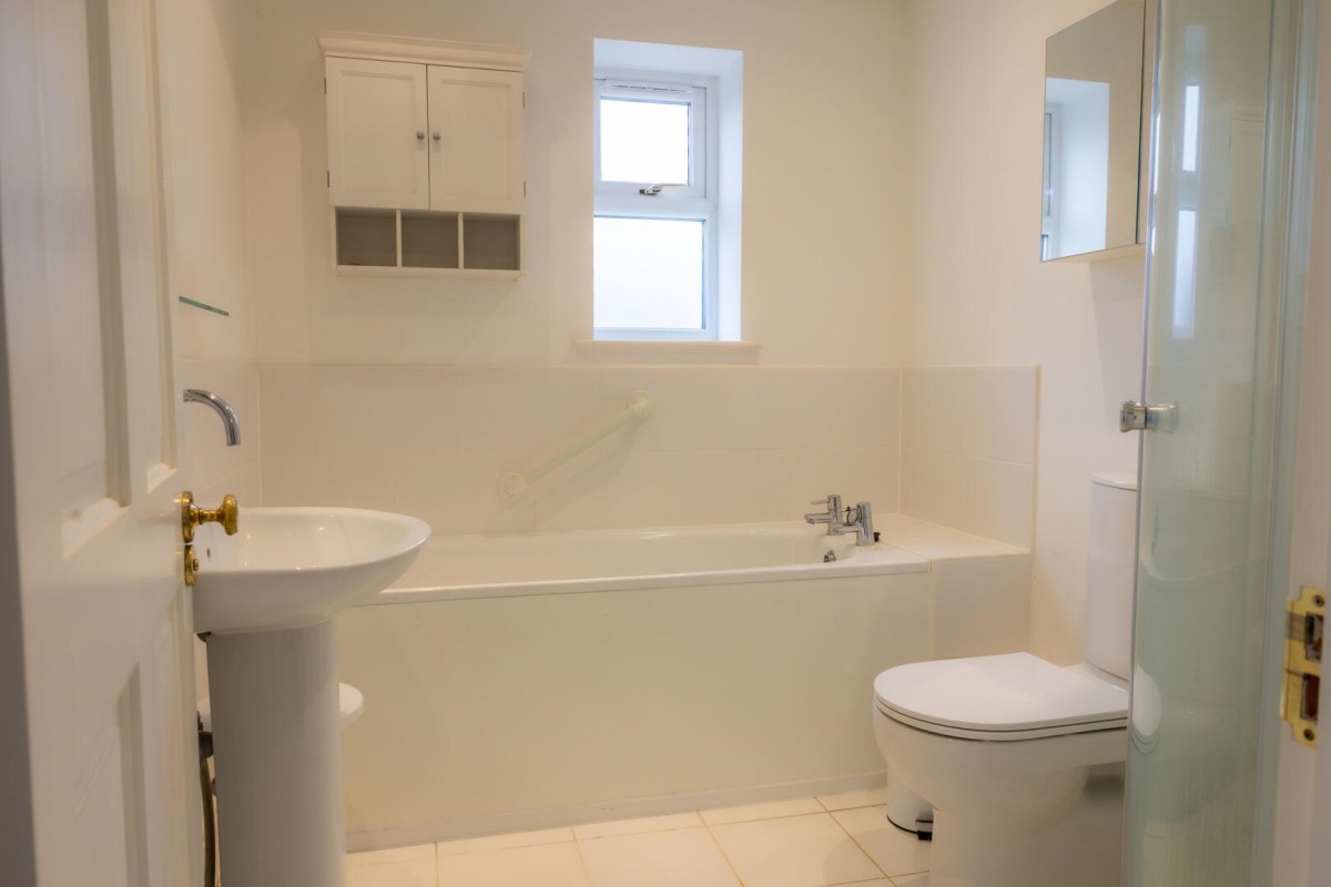 Upstairs, a spacious landing leads to three excellent-sized double bedrooms, all well-proportioned and filled with natural light. The family bathroom is thoughtfully arranged with a bath and a separate freestanding shower cubicle, ideal for modern family living.