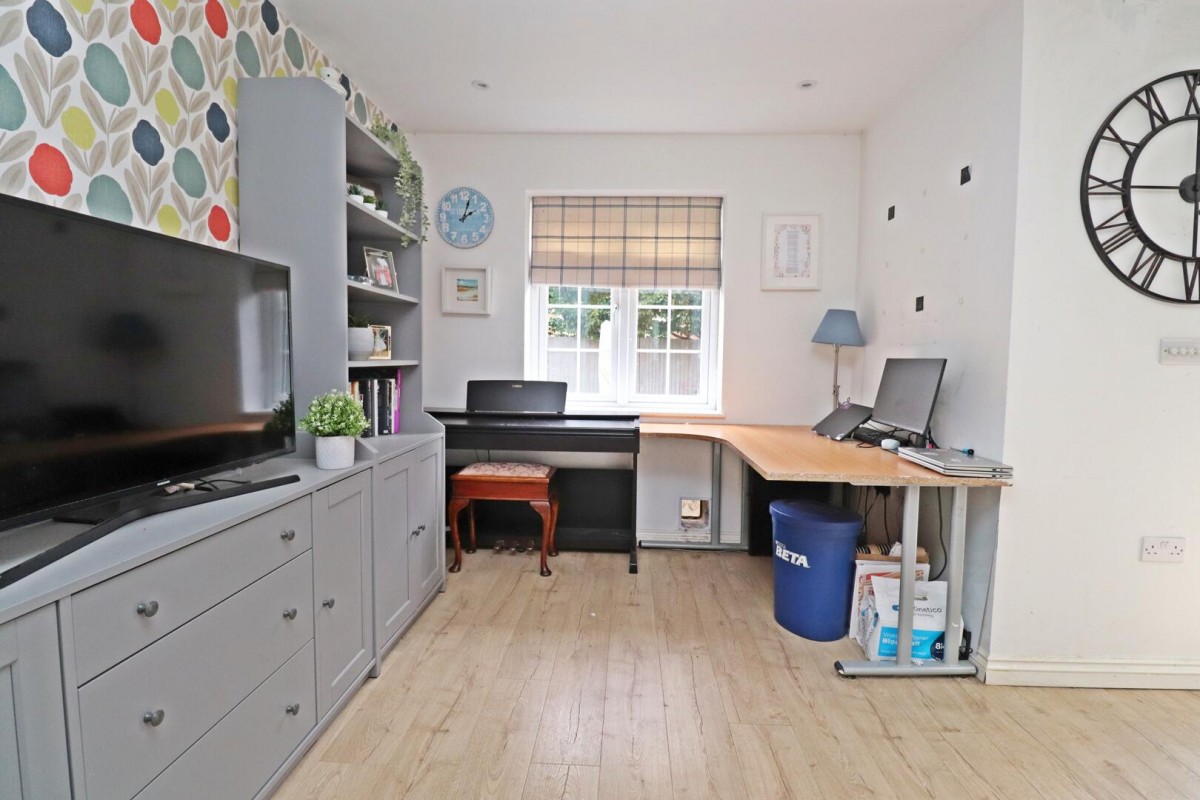 The family room is a bright, versatile space with wood effect flooring and a window that overlooks the garden. It connects directly to the office and the sitting room through double doors, offering flexibility for use as a casual living area or workspace.