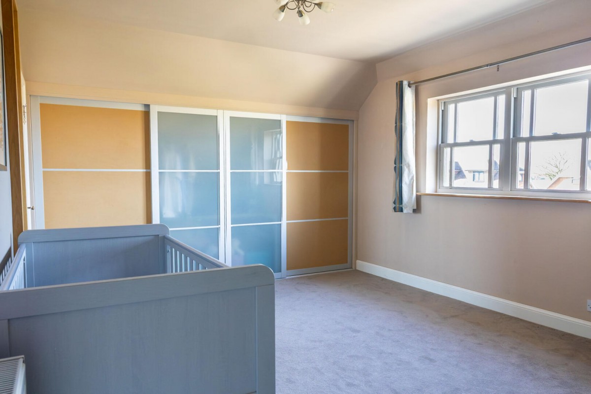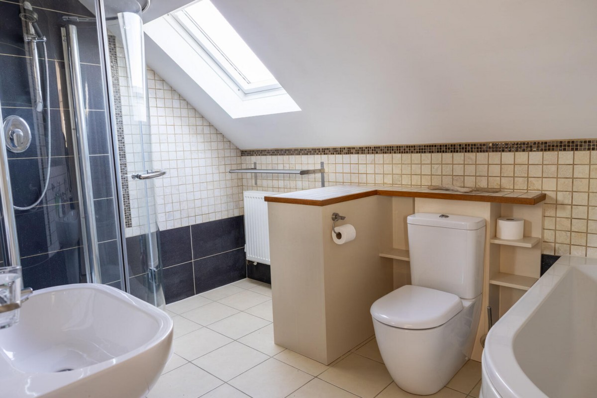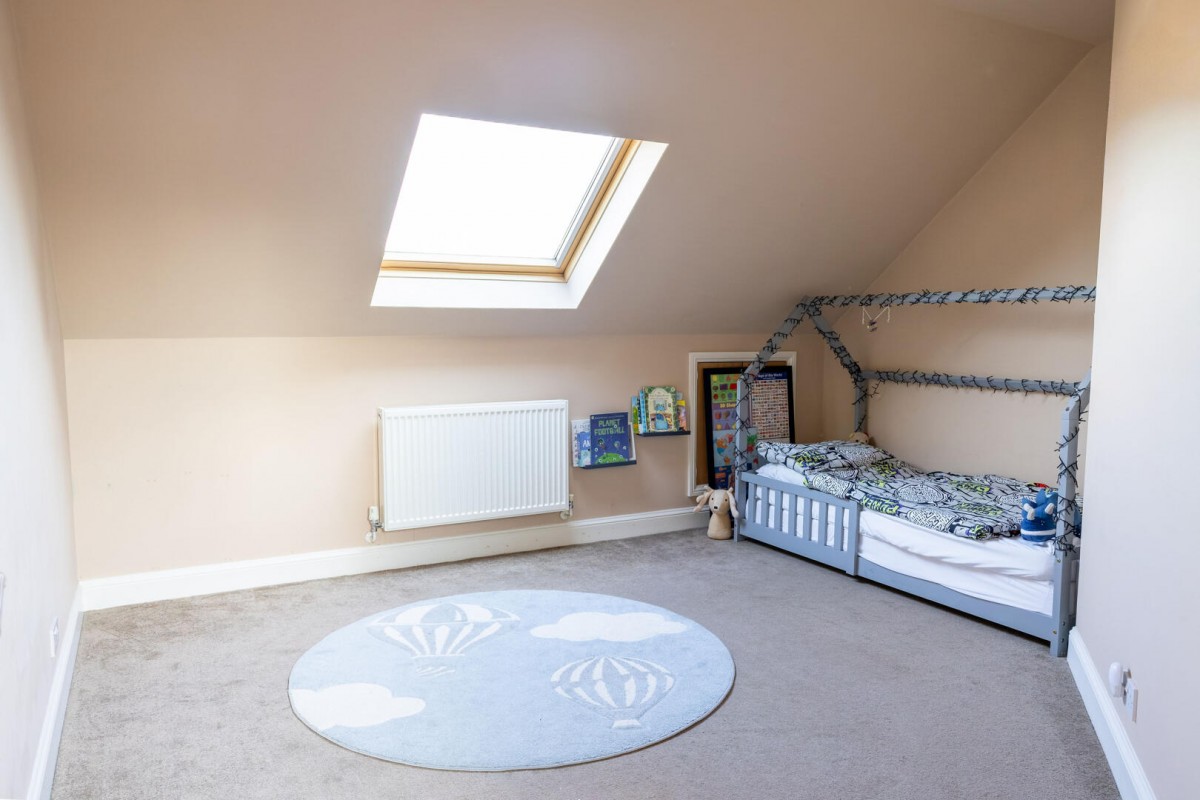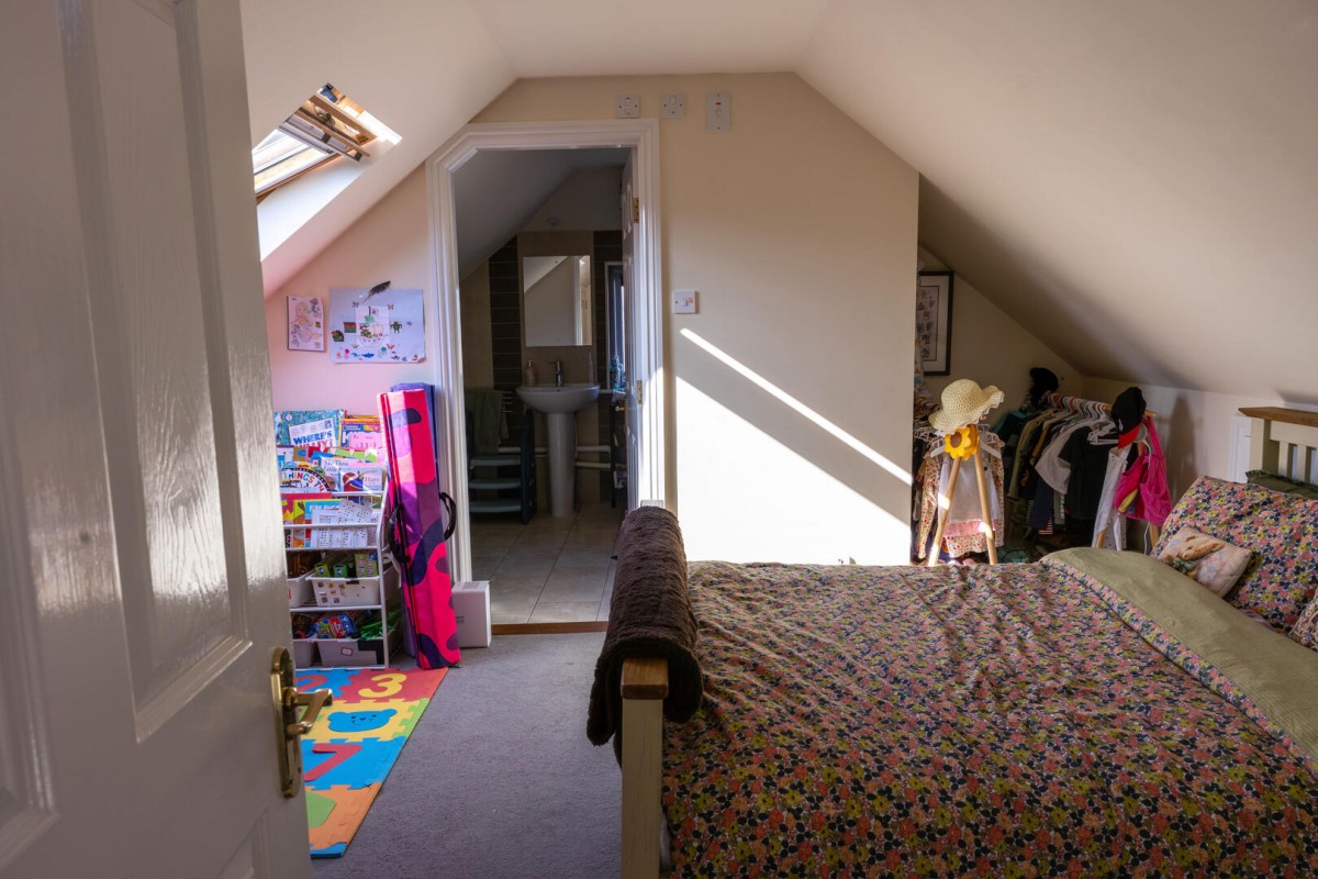 The first floor continues the home’s sense of space and light. The principal suite is an impressive retreat, enjoying generous proportions alongside built-in storage and striking double height glazing complemented by additional skylights which flood the room with daylight. The accompanying en suite bathroom is beautifully arranged with both a bath and a separate walk-in shower, creating a calm and luxurious environment. Two further well-proportioned rooms provide comfortable accommodation and are served by a spacious first floor shower room.