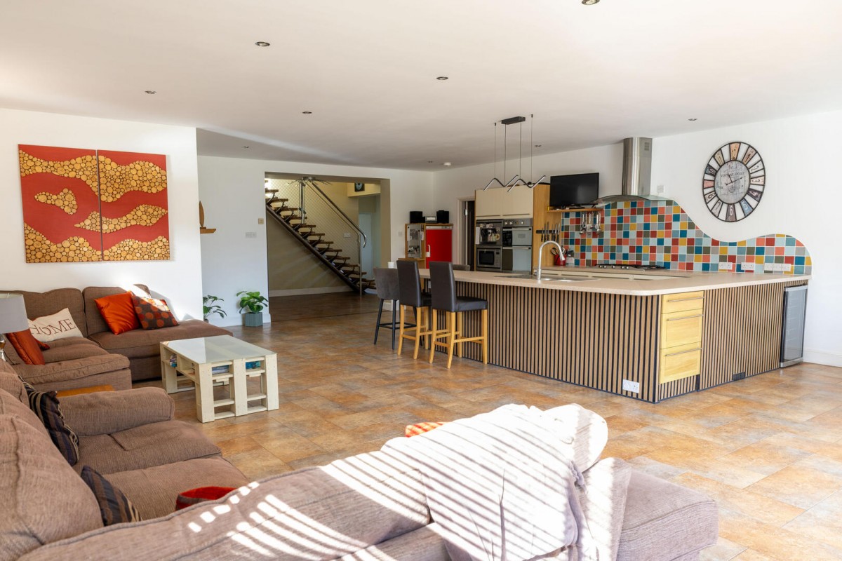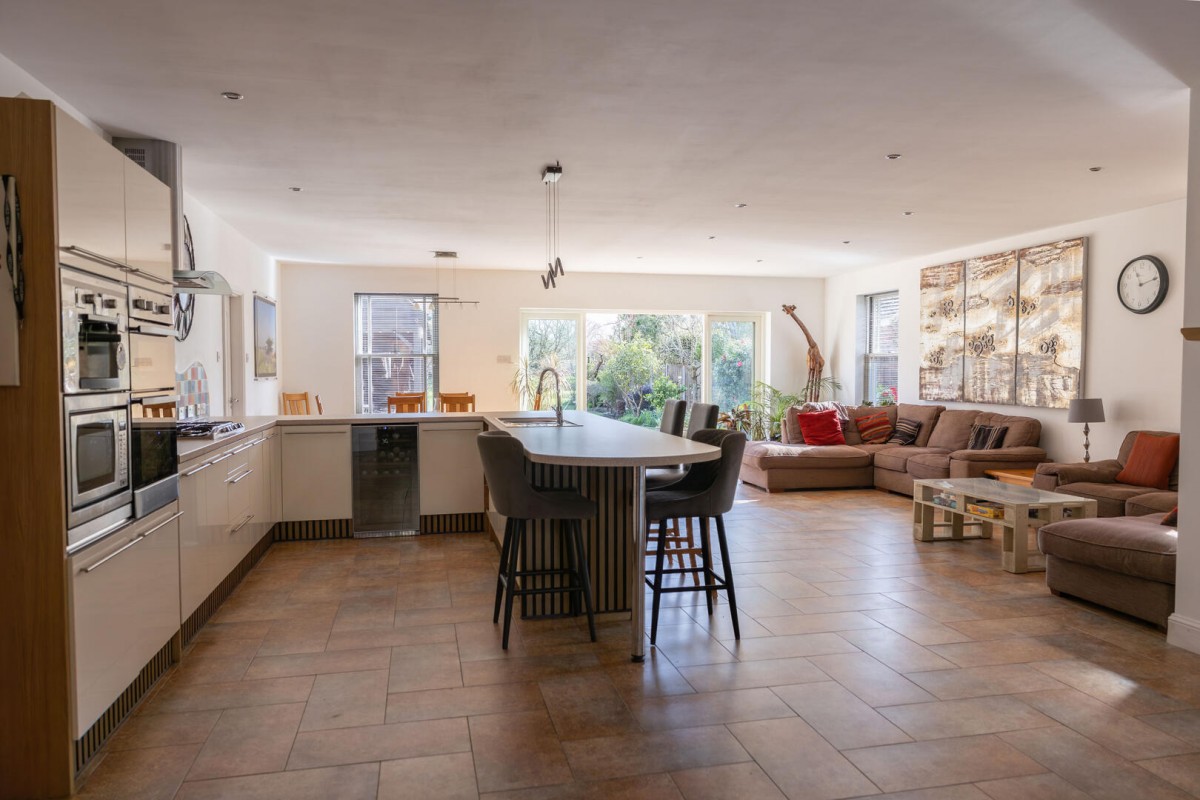 The real centrepiece of the home is the remarkable open-plan kitchen, dining and family space — a room designed entirely around modern living and effortless entertaining. Generous in scale and filled with natural light, this space effortlessly brings people together. The kitchen is beautifully appointed with contemporary cabinetry, integrated appliances and a large breakfast bar which naturally becomes the hub of the home, perfect for casual dining, morning coffee or gathering with friends while meals are prepared. Beyond the kitchen, there is ample space for a substantial dining table capable of hosting large gatherings, while the adjoining sitting area provides a relaxed informal living space that flows seamlessly through French doors onto the garden terrace. Underfloor heating runs throughout this main living space, creating a comfortable and energy-efficient environment year-round.