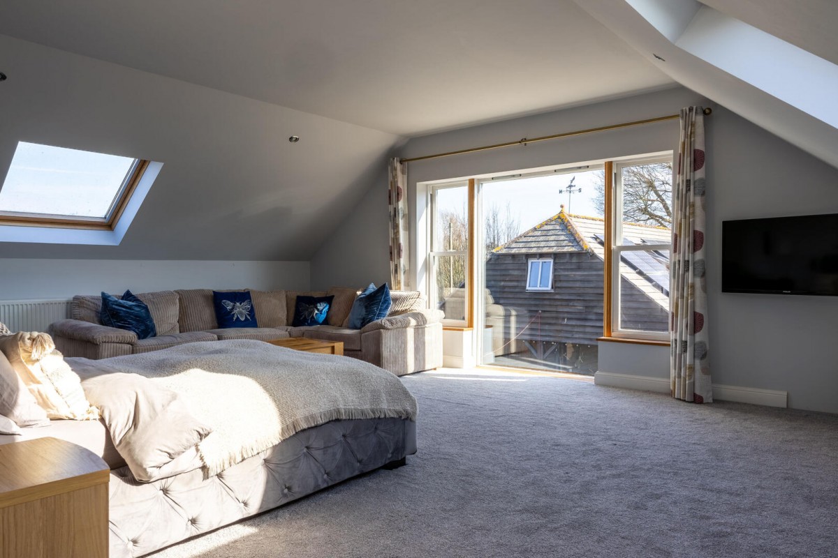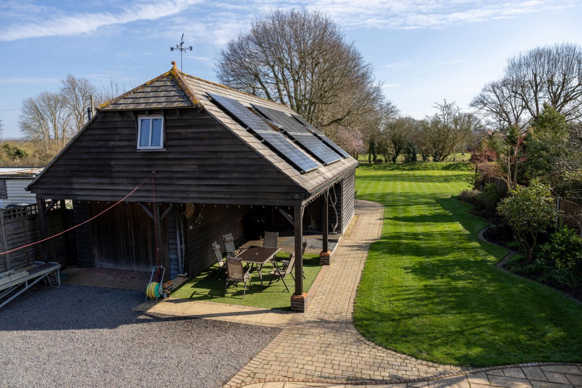 Beyond the main residence sits a substantial detached timber barn-style building that adds a truly exciting dimension to the property. On the ground floor there is a large garage alongside an expansive workshop and gym or storage facility, offering excellent space for hobbies, vehicles, fitness equipment or creative projects. Above this, accessed via an elegant external cast iron spiral staircase, is a superb self-contained apartment arranged around an open-plan living and kitchen space, complemented by a generous private sleeping area and its own shower room. This arrangement provides outstanding versatility, making it ideal for visiting guests, independent family members, or as an attractive rental opportunity while maintaining privacy from the main house.