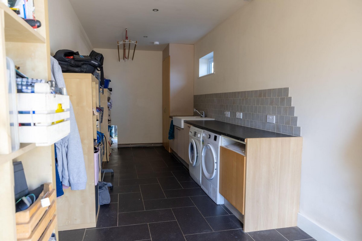 Practical design has clearly been a priority throughout the home. A spacious boot room and utility area sits directly off the kitchen, providing an ideal transition between garden and house. This highly practical space keeps everyday household tasks neatly organised while offering excellent storage for coats, boots and laundry, making it particularly well suited to busy families, pets or country living. The property also benefits from its own walk-in pantry — a highly desirable feature that provides exceptional food storage and keeps the kitchen beautifully uncluttered while remaining incredibly convenient for everyday use. A cloakroom completes the ground floor accommodation.