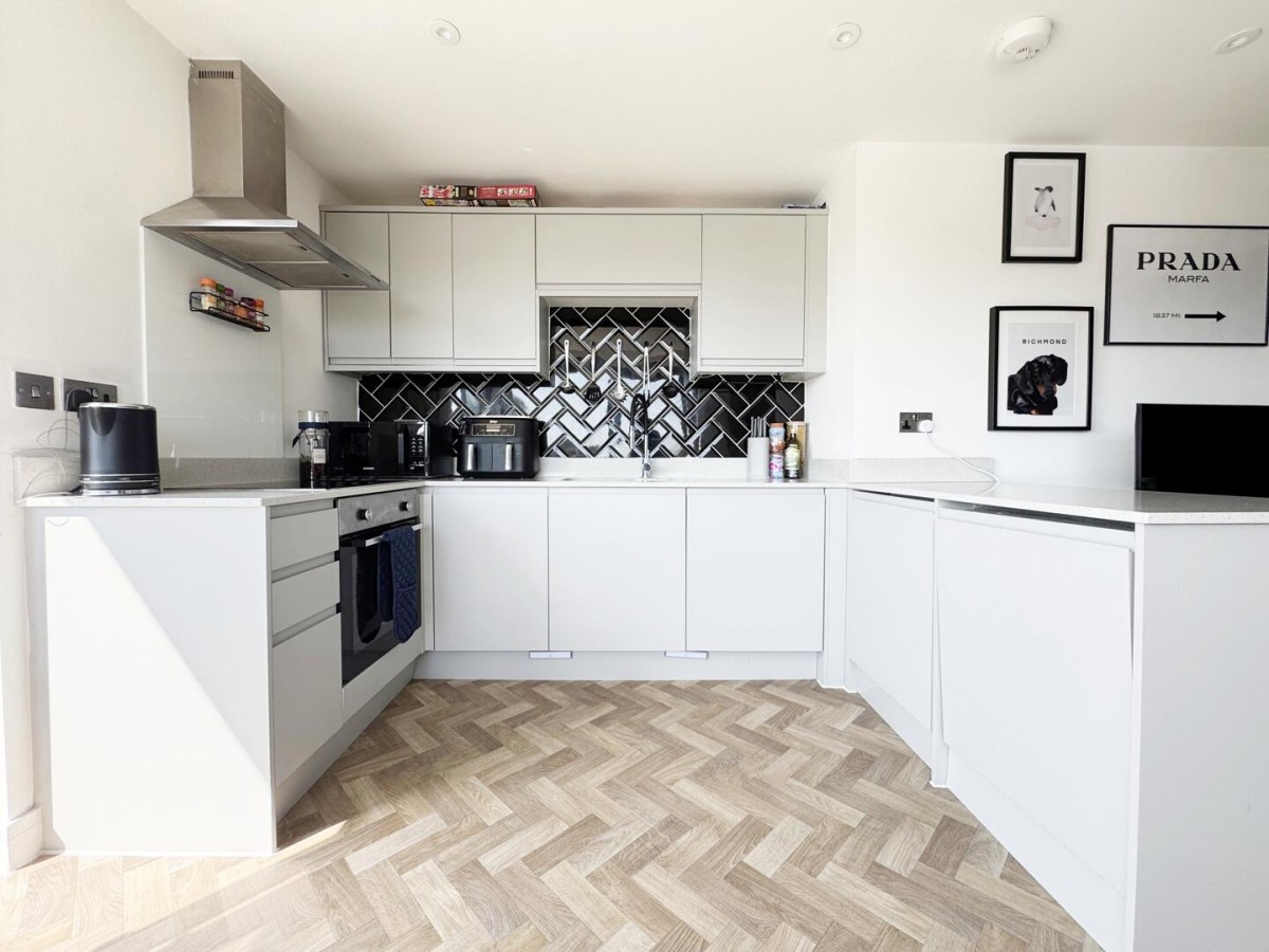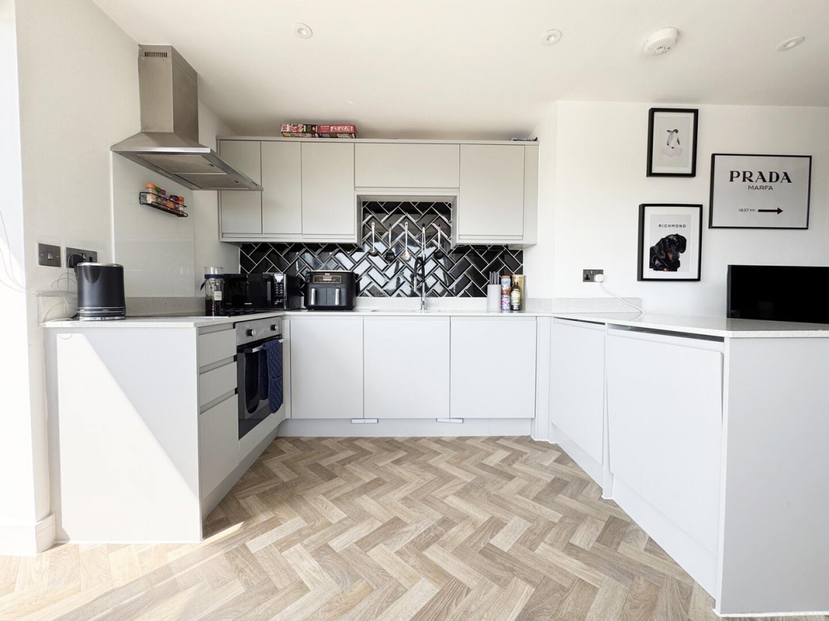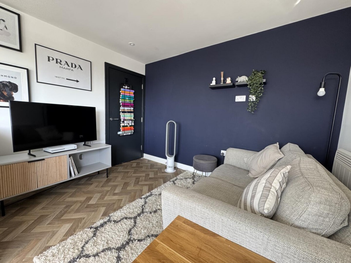 The standout feature is the open-plan kitchen, dining and living space — a bright, sociable room that comfortably accommodates both seating and dining areas. Dual aspect glazing and sliding doors allow plenty of natural light to pour in, while also providing direct access onto a private balcony, offering a pleasant spot to sit out and unwind.