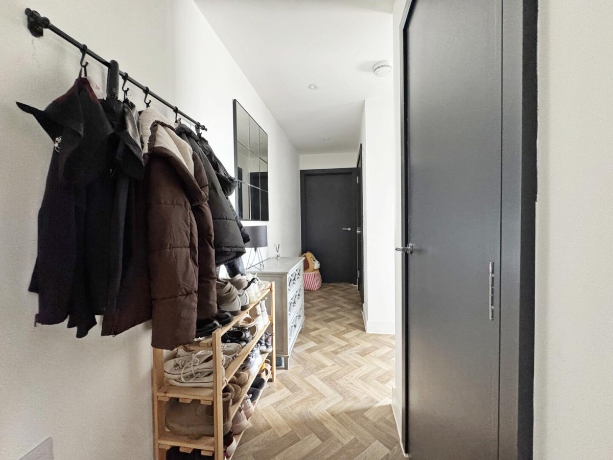 Accessed via a secure entry system with lift service to all floors, the apartment opens into a welcoming hallway that connects the entire home. The layout has been thoughtfully designed to make the most of the available space, with built-in storage and a natural flow through to the main living area.