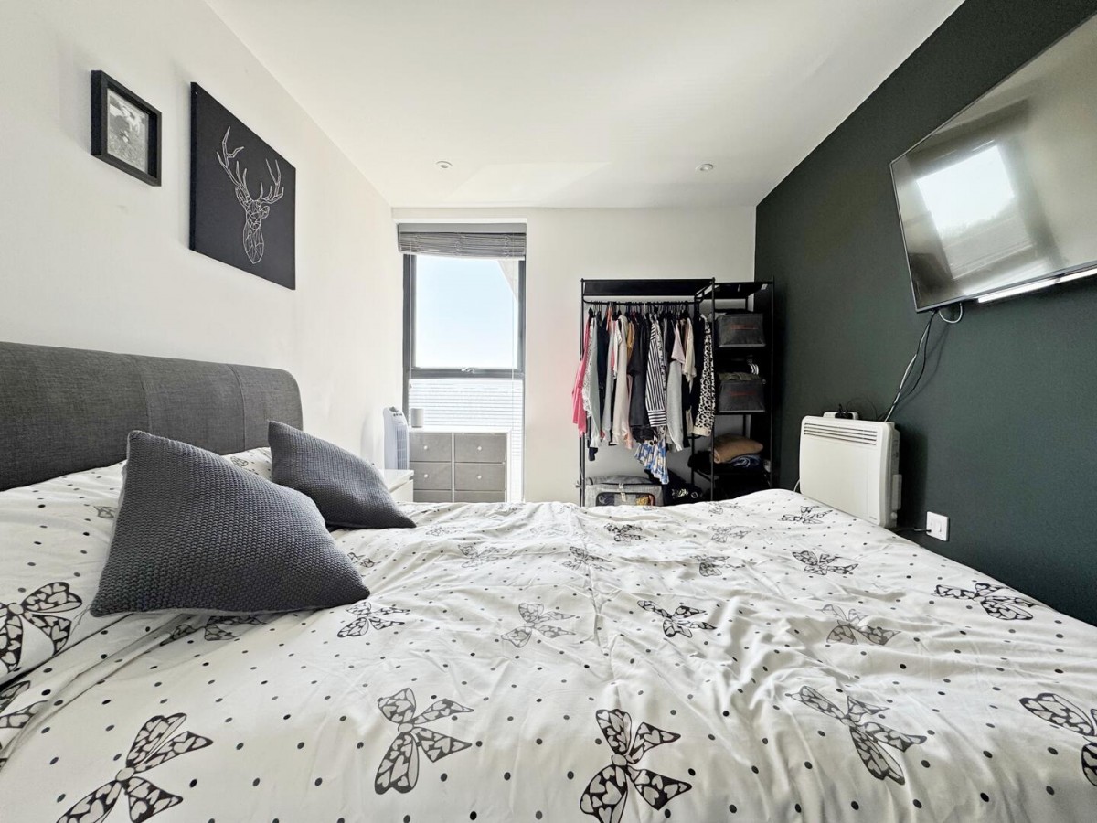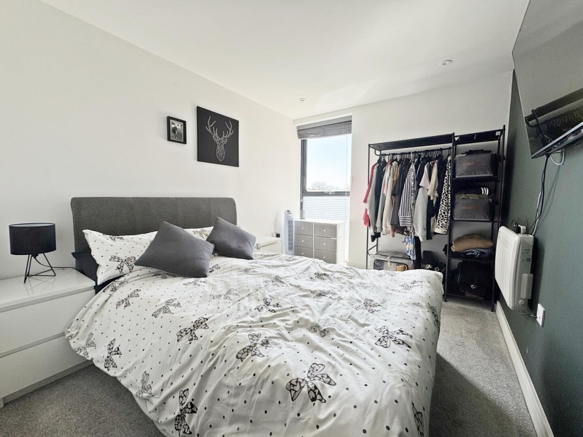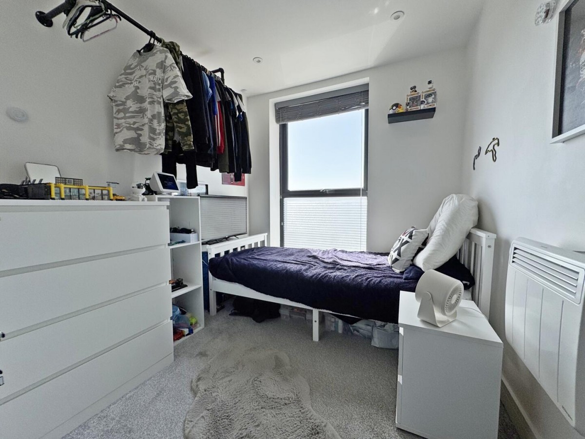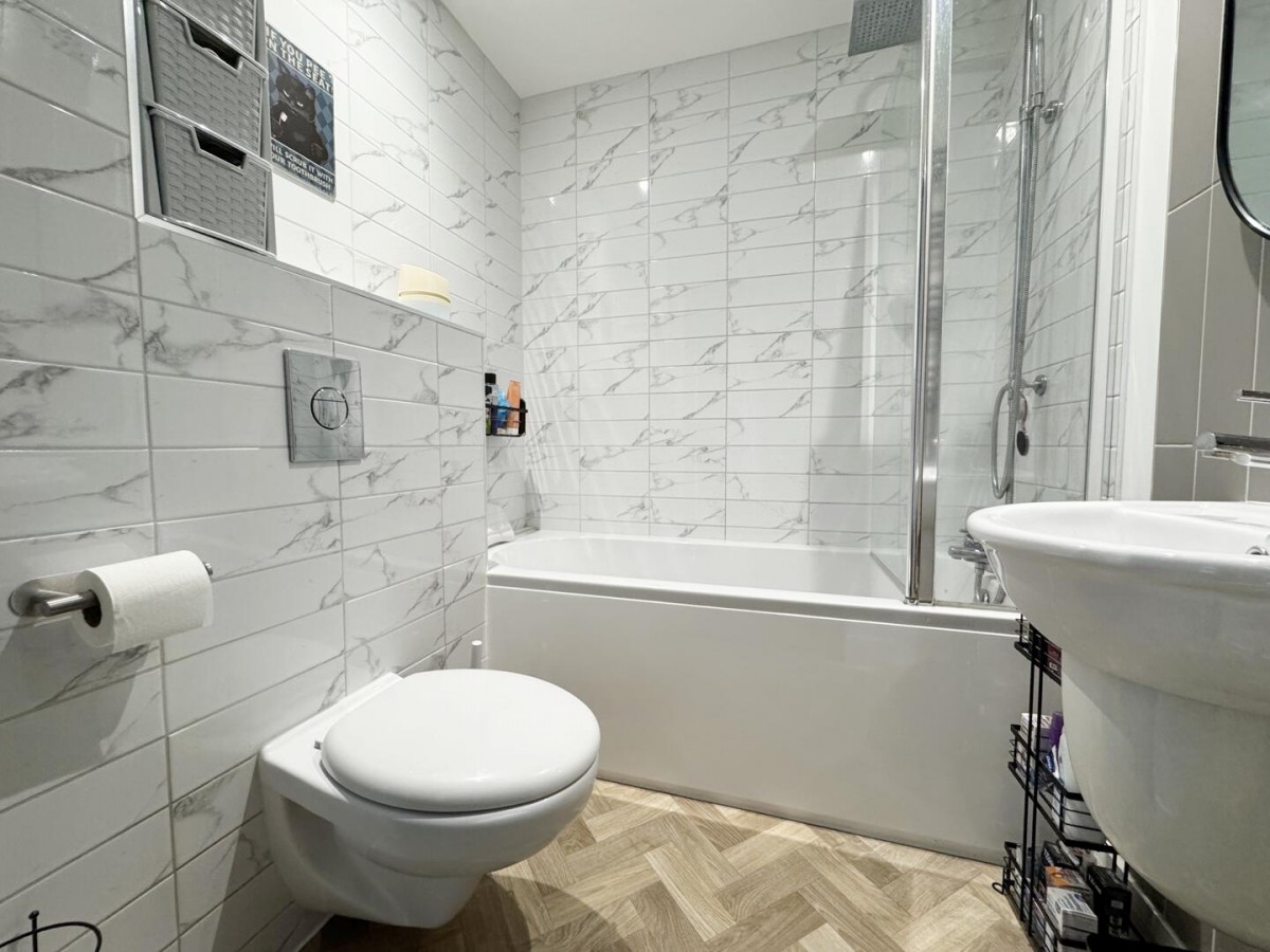 There are two bedrooms positioned off the hallway. The main bedroom is a generous double with a calm, neutral finish, while the second room works well as a single bedroom, home office or guest space, depending on requirements. The bathroom is finished in a modern style, fitted with a full suite including a bath with overhead rainfall shower, basin with storage and WC.